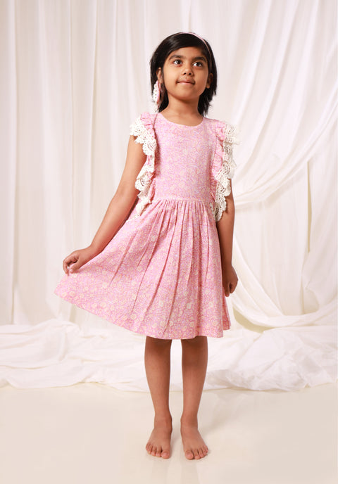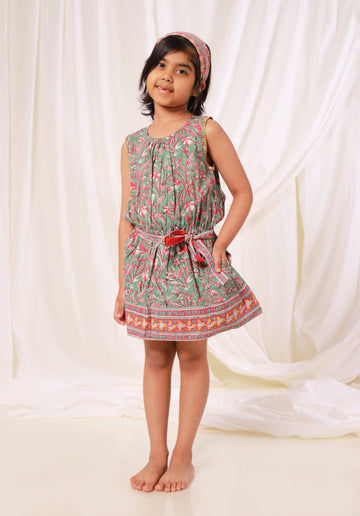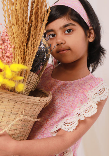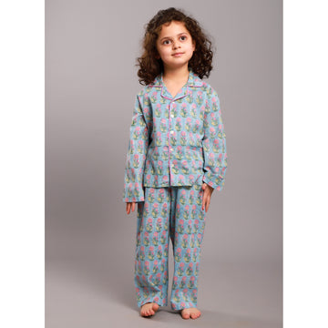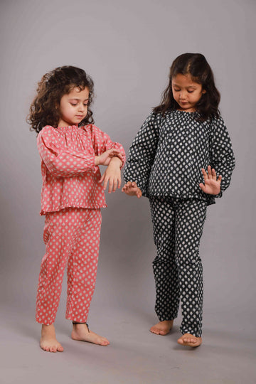 Block Printed Girl's Nightsuit set Ethnic buti Blue- Pink