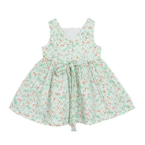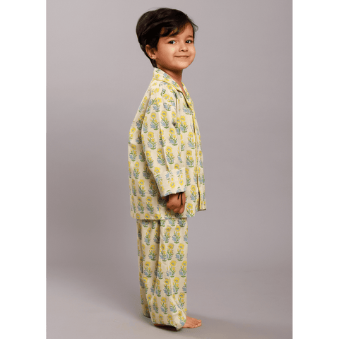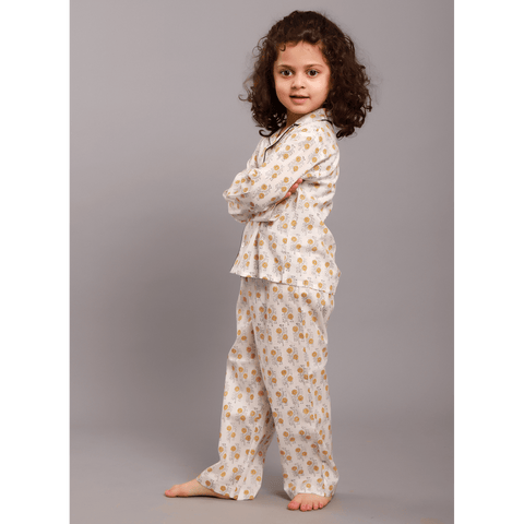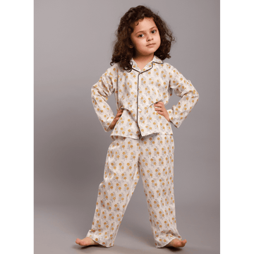 Block Printed Girl's Nightsuit set Ethnic Beige- Yellow Buti