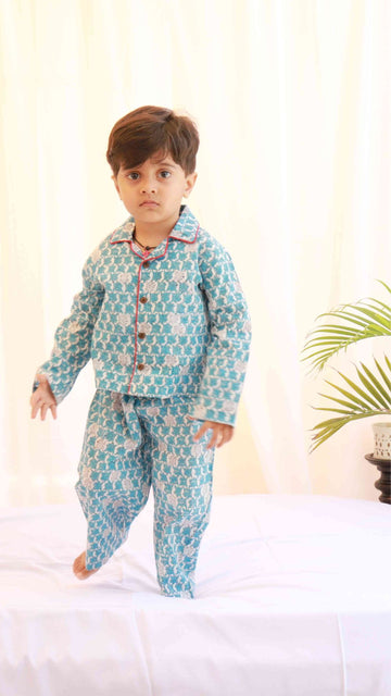 Block Printed Unisex Night Suit Set Tortoise Blue