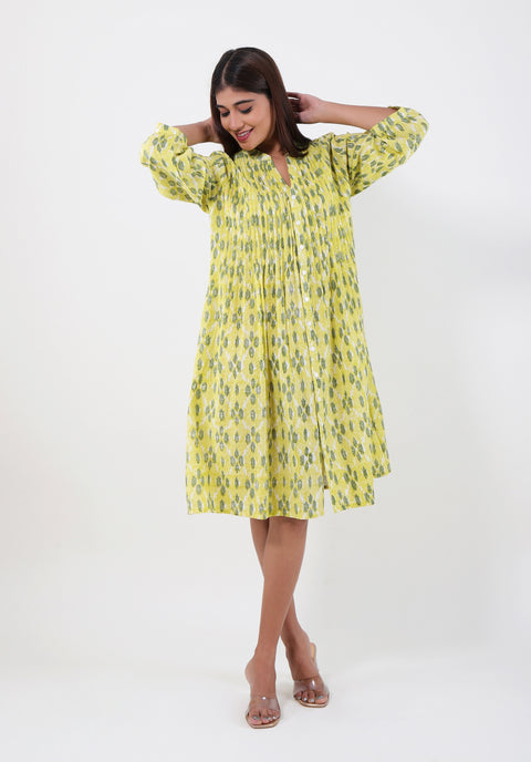 Women Printed dress Kris pin tuck ikkat kantha Yellow