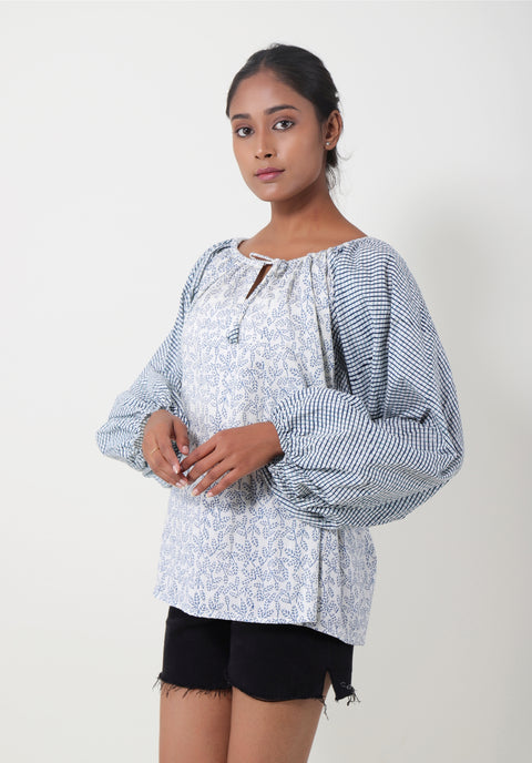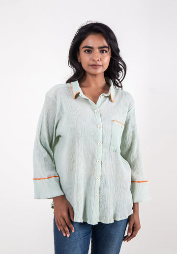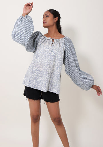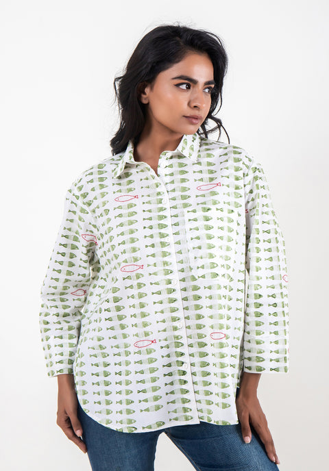 Women Block printed Piyu Oversized shirt Ikkat Kantha Blue