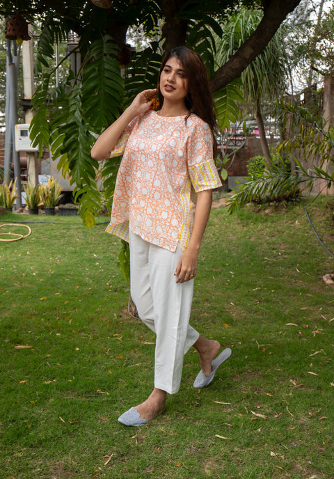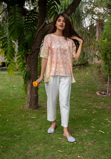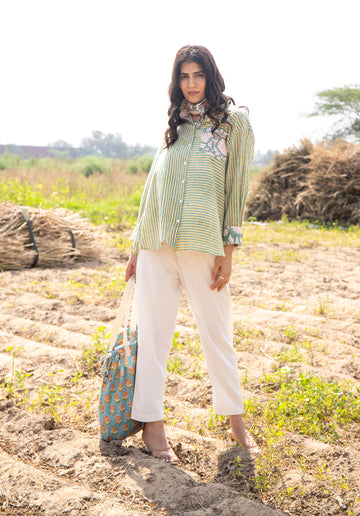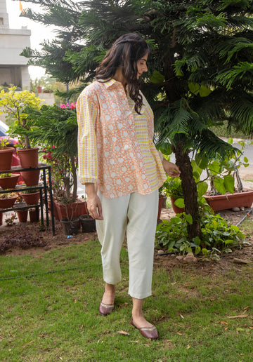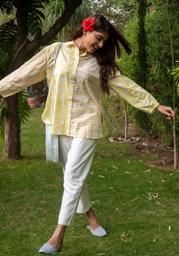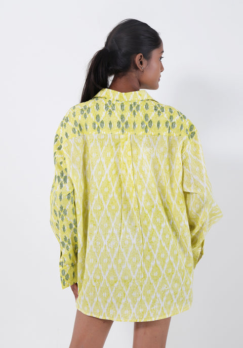 Women Block printed Piyu Oversized shirt Ikkat Kantha Yellow