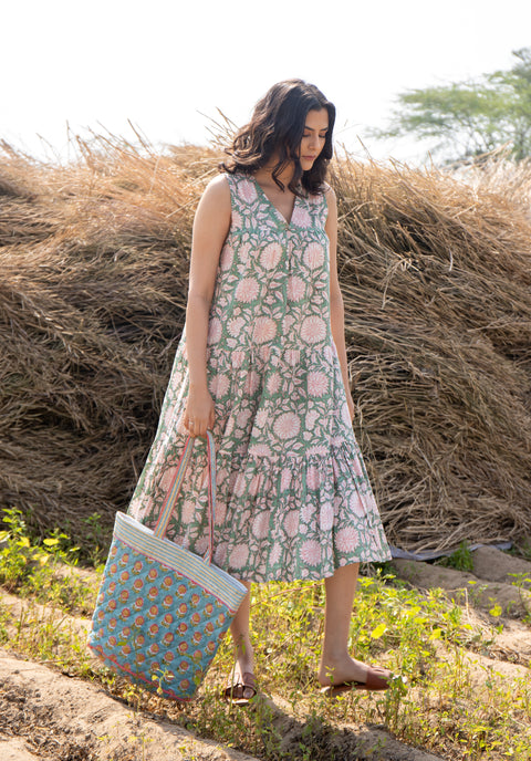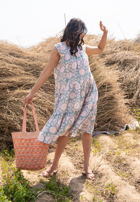 Women Printed dress Kris pin tuck ikkat kantha Blue