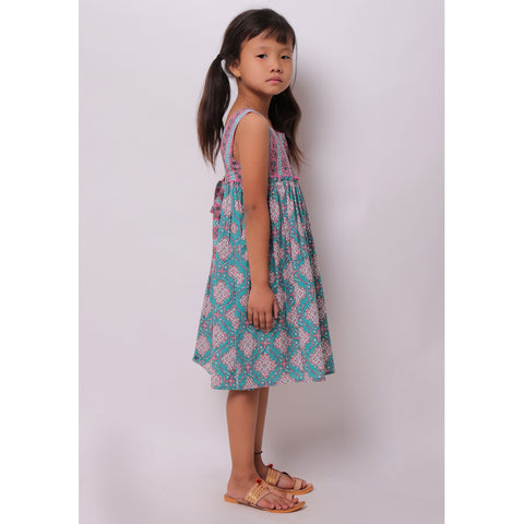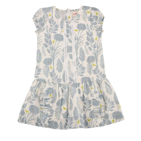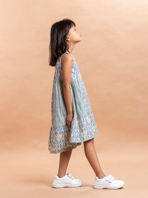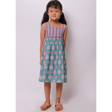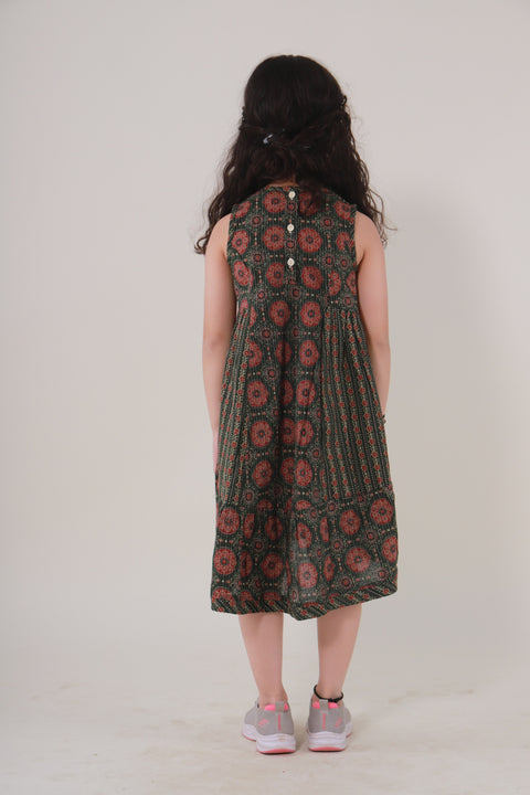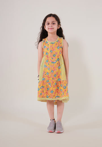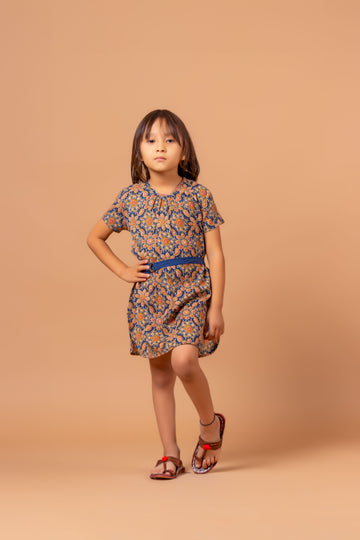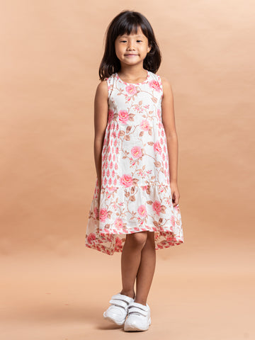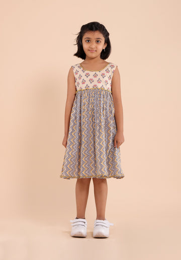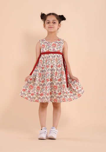 Girls Printed Floral Ethnic JaalDress Beige- 20400