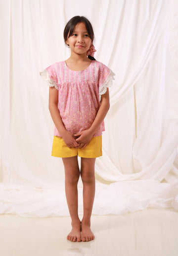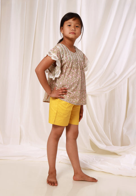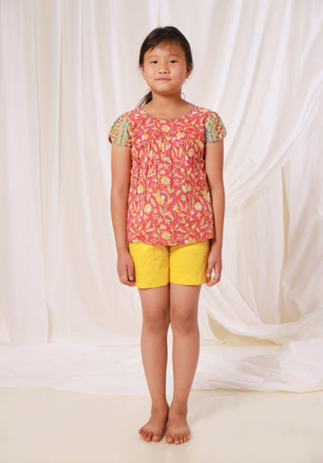 Girl's Block printed Top Ananya Ikkat Kantha Yellow