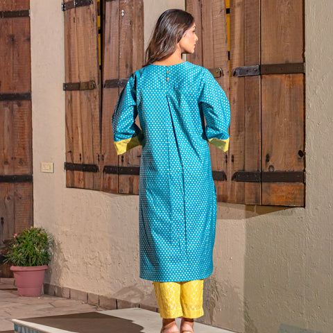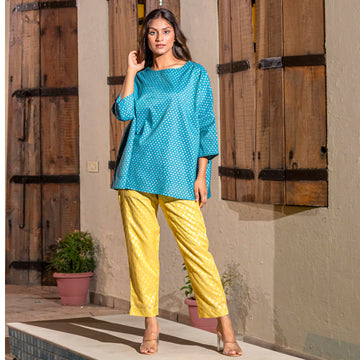 Women Jaquard Chanderi Kurta pants set Blue- Yellow