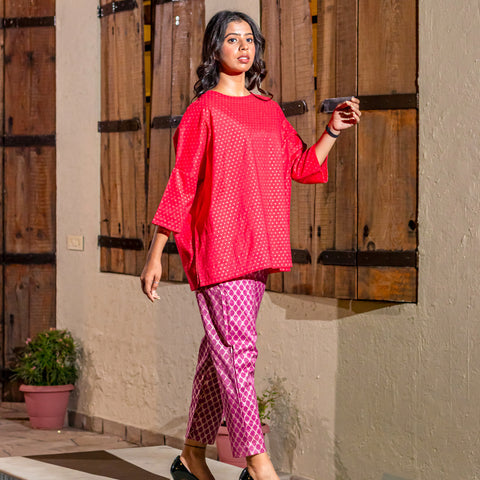 Women Jacquard Chanderi Over sized Shirt Coord Set Pink- Purple